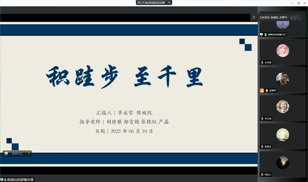 经验分享结束后,研一研二的八位同学汇报了这学期的学习成果和暑假计划,针对同学们的汇报内容,郑雪艳老师指出:1、不积跬步无以至千里,考取博士是一个积累的过程;2、希望大家都能找到自己的目标,无论未来是选择考博还是工作都要铭记六个字:自信、勇敢、坚持;3、员工要有学习的主动性,要加强、要主动与导师沟通。