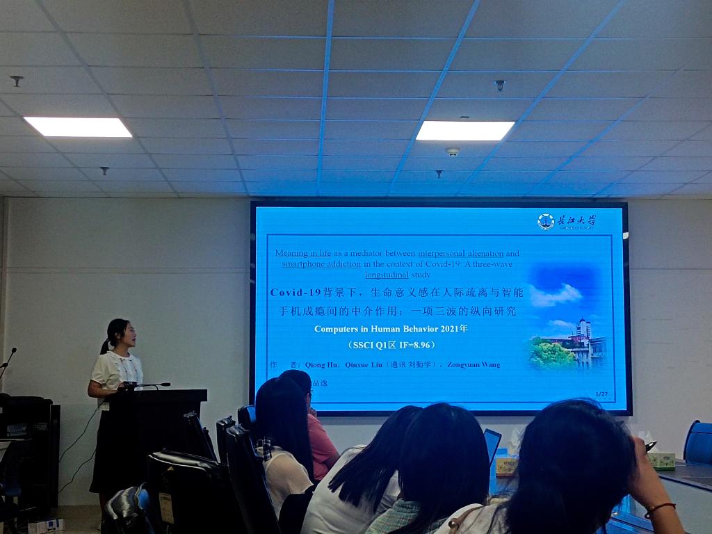 接着,研二同学王品逸汇报了2021年发表在《Computers in Human behavior》上的文章《Meaning in life as a mediator between interpersonal alienation and smartphone addiction in the context of Covid-19: A three-wave longitudinal study》。王品逸在汇报文献之前,向大家就研究的类型做了简短而清晰的论述,论证了横断研究、追踪研究以及聚合交叉研究之间的区别与联系,并为后续文献汇报奠定知识基础。本篇研究探讨了随着疫情得到控制,老员工的人际梳离感、生命意义感以及智能手机成瘾三者有何趋势,又有何关系。文章通过纵向研究设计,得出结果:老员工的人际疏离增加,生命意义感增加,智能手机成瘾的风险降低。且意外发现,智能手机成瘾会负向预测老员工的人际疏离,与以往其他研究一致。最后,王品逸同学总结了这篇文章给她带来的启示:1.很多变量会影响个体在新冠疫情背景下的表现,后续可多方面研究如何减少消极事件对个人的负面影响;2.后续可进行跨文化研究,更具针对性,并使用更多方法来进行测量。
