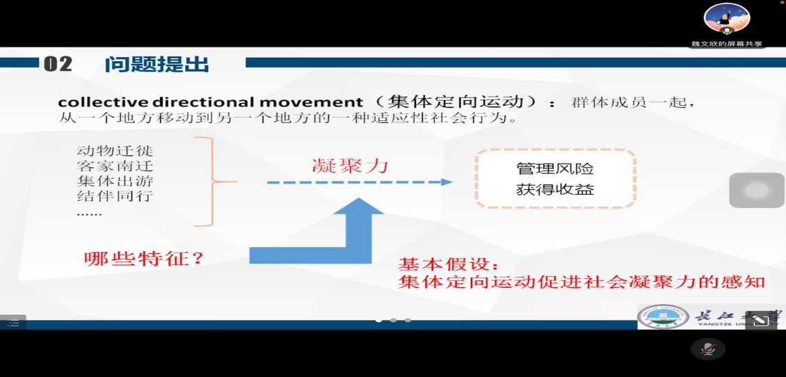 魏文欣同学从作者介绍、问题提出、四个实验研究、局限与展望等四个方面对文献进行了汇报。首先,她从作者的研究方向及成果入手,指出了作者对社会凝聚力的影响因素的关注,引出本篇文献主题是探讨集体定向运动对社会凝聚力的促进作用。然后,分别从研究假设、被试、实验设计、数据分析和结果对四个实验做了细致的阐述。最后,针对研究的局限性和未来展望进行了梳理,指出今后研究可以改进的方向。
