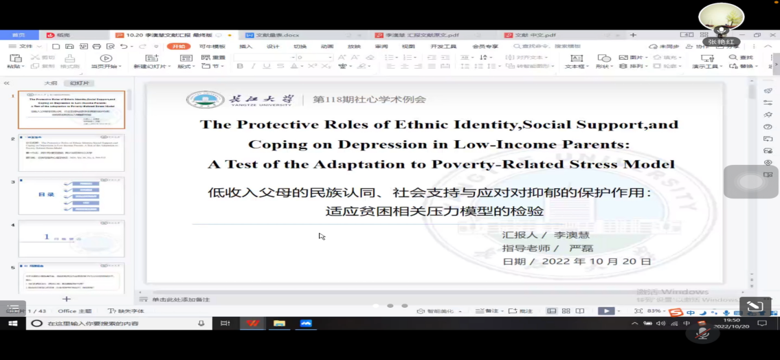 (通讯员,龚锰)2022年10月20日晚19点至21点,第118期社会心理学学术例会通过腾讯会议线上举行。参加例会的导师有郑雪艳老师和张艳红老师,以及18名研究生和2名本科生。本次例会由研一陈錾昕同学主持,研一李澳慧同学和魏文欣同学进行文献汇报,汇报的文献分别是《The Protective Roles of Ethnic Identity,Social Support,and Coping on Depression in Low-Income Parents: A Test of the Adaptation to Poverty-Related Stress Model》;《Collective Directional Movement and the Perception of Social Cohesion》。