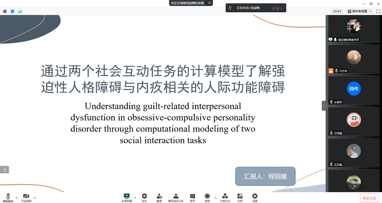 接下来,程丽媛同学对文献《Understanding guilt-related interpersonal dysfunction in obsessive-compulsive personality disorder through computational modeling of two social interaction tasks》进行汇报分享。研究从引言、方法、结果、讨论和结论五个部分为我们详细介绍。研究关注强迫性人格障碍和内疚之间的关系,从而提出以下假设:H1:由于共情能力不足,OCPD患者可能比健康对照组(HC)表现出更少的内疚相关反应,这可能导致OCPD相关的人际功能障碍;H2:作为强迫症的候选成员,OCPDs可能比HCs有更强烈的内疚相关反应。并考察了两种人际互动任务。最终得出了与HCs相比,OCPD参与者往往较少受到内疚的影响:他们在做出合作决定时表现出较少的内疚厌恶;并且在伤害他人后表现出较少的内疚诱导的补偿的实验结论。最后,同学们针对本研究提出了自己的疑问和想法。
