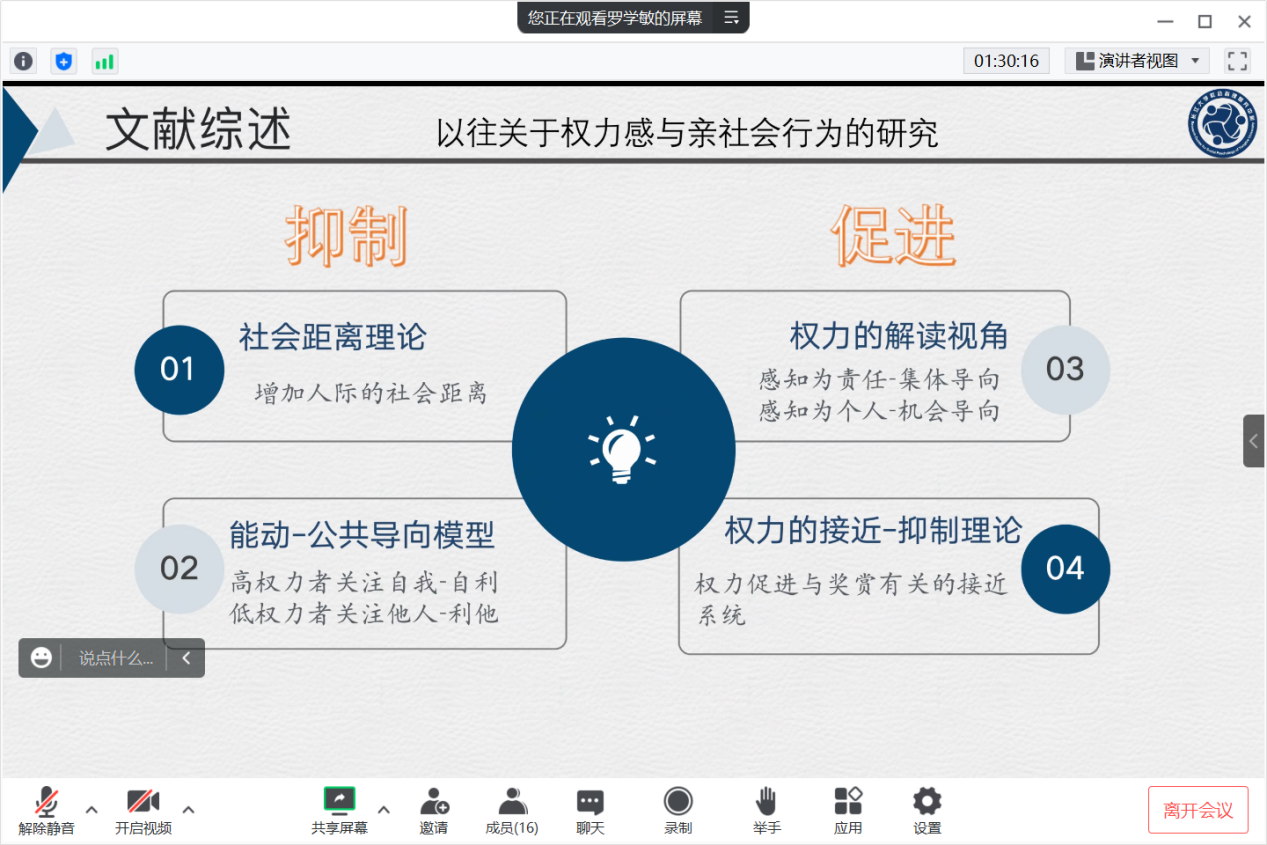 最后,罗学敏从选题背景、研究思路与方法、研究结果以及研究结论与讨论四个方面进行了汇报。本研究以社会信息加工模型和情景聚焦理论为基础,探讨权力感对老员工亲社会行为的影响。研究一采用问卷法探究权力感对老员工亲社会行为的影响以及认知灵活性和心理可得性的链式中介作用。研究二采用回忆法操纵老员工的权力感,通过让被试回忆自己评价(被评价)的事迹来启动老员工的高(低)水平的权力感,并探讨其对亲社会行为的影响以及检验链式中介模型。