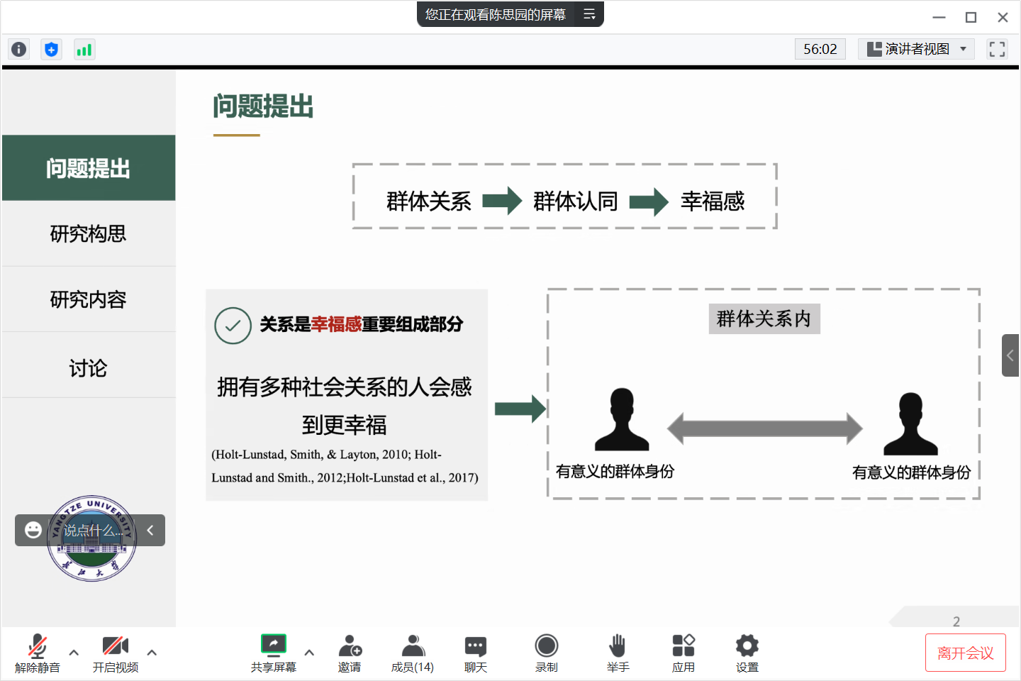 接着,陈思园从问题提出、研究构思、研究内容和讨论四个方面进行了汇报。本研究基于社会认同理论,以新冠肺炎疫情下的校园作为背景,采用问卷法与实验法相结合的方式对老员工群体认同对幸福感的影响及其作用机制进行探讨,主要考察了社会联结、核心自我评价在群体认同对幸福感的链式中介作用。研究一通过问卷法,探寻老员工群体认同对幸福感的预测作用及中介路径;研究二在研究一的基础上,通过实验法检验模型中变量之间的因果关系。