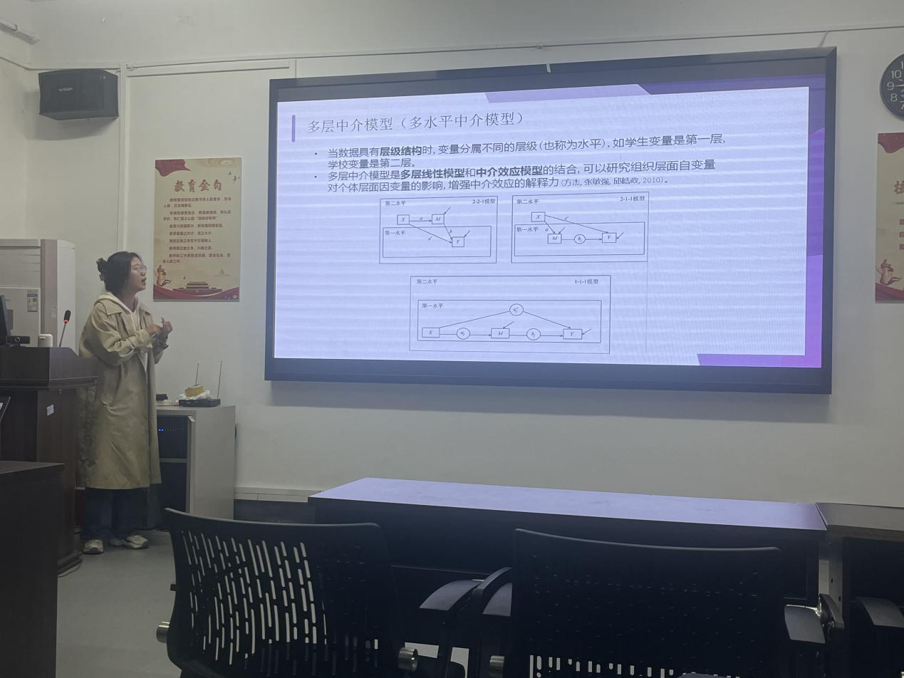 首先,夏领域同学给我们分享2019年发布在《Journal of Happiness Studies》杂志上的一篇文献,文章的题目是《Hope as Mediator Between Teacher–Student Relationships and Life Satisfaction Among Chinese Adolescents: A Between-and Within Person Efects Analysis》,文章是从纵向角度进行研究,夏领域同学从六个方面进行汇报。首先进行知识补充,介绍该篇文献采用的新的纵向设计研究方法:多层中介模型,讲解了该模型的原理、检验它的mplus语法以及插件MLmed。紧接着进入文章内容讲解,秦珂楠同学从引言到结果讨论一一进行剖析。在汇报尾声,提出自己的收获和思考。汇报过后,连帅磊老师该模型和插件进行补充说明。随后张泽同学、曹晓萱同学、吴欣格同学以及本科生同学提出了自己的疑问,连帅磊老师、朱晓伟老师对同学提出的问题进行了回答。最后,各位老师对文章进行讨论,朱晓伟老师对组内同学提出要求,建议同学们应该用数据进行实操。