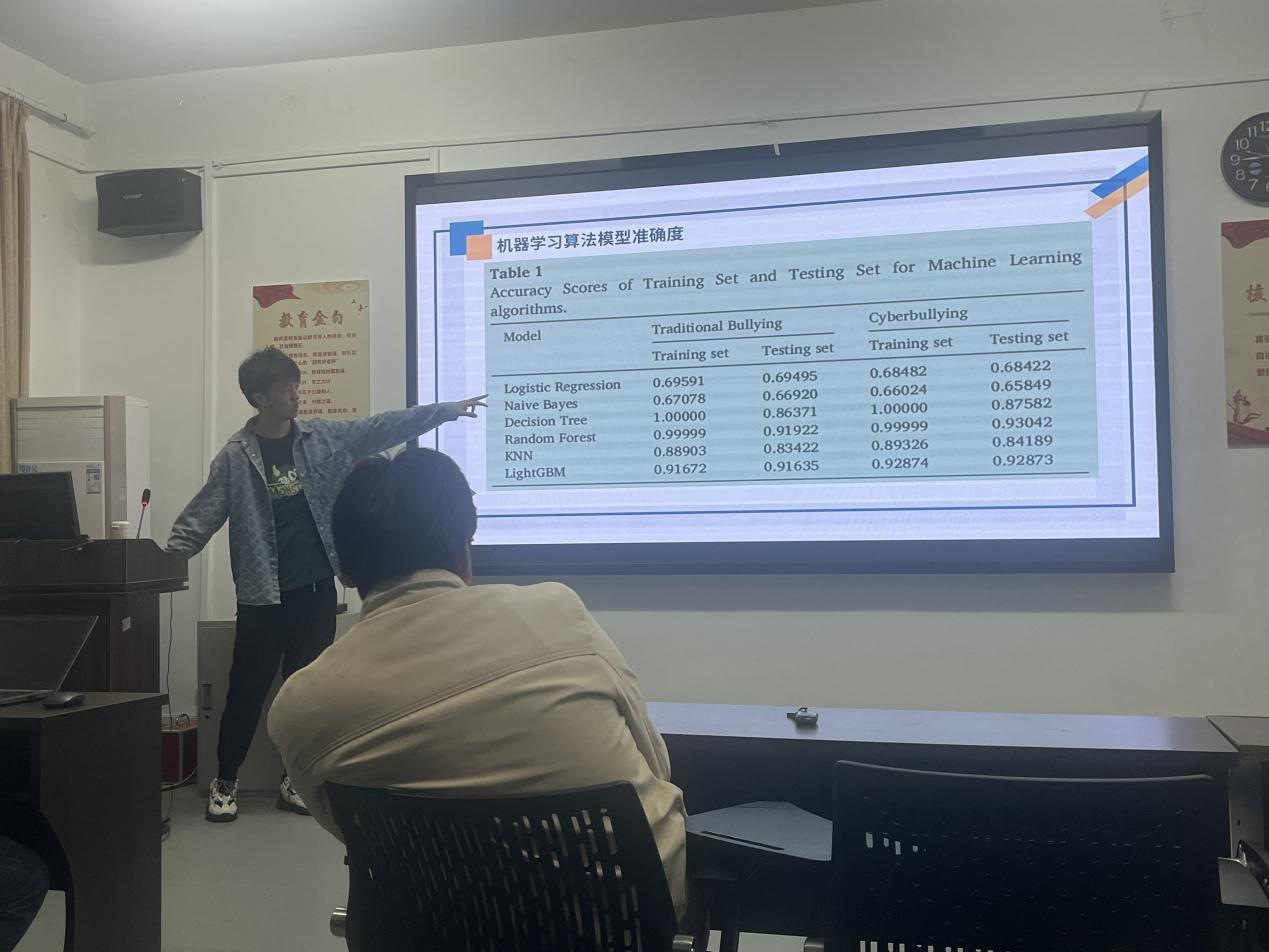 紧接着,蒲俊伟同学汇报了清华大学心理学团队发表的《Detecting the risk of bullying victimization among adolescents:A large-scale machine learning approach》。该文章内容简洁明了,逻辑思路清晰,利用大数据机器学习方法检测青少年的欺凌受害风险 。蒲俊伟同学从研究背景、研究工具与方法、研究结果与讨论四个方面进行汇报,对文章中出现的概念、使用的方法进行讲解,带领大家看文章中的图表和数据。汇报结束后,秦珂楠同学提出存在多种机器学习方法,是否需要对每一种方法进行检测,老师们帮助理解和解答。朱晓伟老师提出疑问。当数据较少时该方法是否适用。最后,朱晓伟老师认为这种方法对实验基础要求较高,现阶段我们可以进行了解,开开眼界,建议大家在每周汇报之间都看看文献,一起学习一起进步,希望大家都可以从每周汇报中学到新的东西。