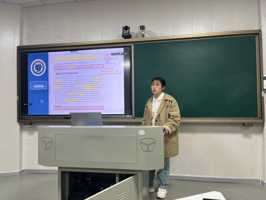 在教师点评环节,针对刘嘉玲的文献汇报,杨林川老师首先肯定了该同学的汇报状态;并提出几点疑问:(1)社会流动的方向性是否存在意义;(2)由于中国人看重长期社会流动,该研究是否符合中国本土;不同文化之间的流动性是否存在差异。严老师首先肯定了该同学汇报的逻辑性,认为使用更加清晰易懂的图表能够帮助大家进一步理解该文献;唯一遗憾的是该同学没有在汇报时间上进行合理把控,并且文献的发表时间较为久远;最后指出系列行为实验是值得大家学习的;严老师对全中心员工表示,心理学研究过程是坎坷的,常常会出现实验数据出现不显著等现象,并鼓励大家要“耐得住寂寞”,这样才能“守得云开见月明”。