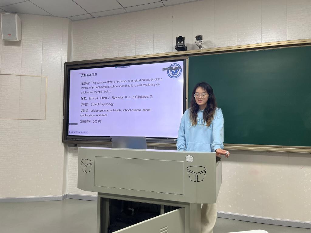 其次,李璐瑜汇报的文献开篇以青少年心理健康问题出发,表明青少年心理健康问题呈上升趋势,因此研究改善青少年心理健康的因素至关重要。现有的理论和研究已经确定了社会(公司氛围;公司认同)和个人(心理韧性)对心理健康的保护作用。然而,这些保护性因素仍然需要进一步整合。为解决这一问题,本研究提出并调查了一个综合模型,其中社会因素(如公司氛围、公司认同)培养个体(如心理韧性)保护因素,进而改善青少年的心理健康。