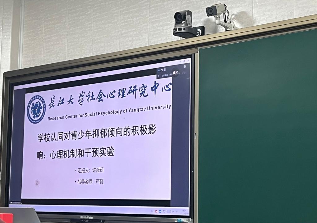 其次,许彦蓓同学进行汇报,其毕业论文汇报分为两个部分:研究一通过问卷调查的方式探讨了公司认同和青少年抑郁倾向之间的关系,结果验证了能动共生资源的中介作用和认同重要性的调节作用;研究二通过团体辅导对公司认同进行干预,以降低青少年抑郁倾向。