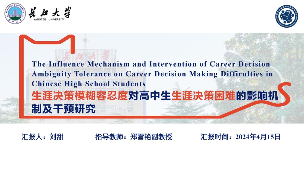接着,刘甜同学汇报的毕业论文基于后现代生涯理论、前景理论,采用问卷法与实验法探讨了生涯决策模糊容忍度对高中生生涯决策困难的影响机制。研究结果表明:(1)高中生生涯模糊容忍度能够负向预测其生涯决策困难水平;(2)积极生涯应对策略在生涯模糊容忍度与生涯决策困难之间起中介作用,生涯社会支持在积极生涯应对策略与生涯决策困难之间起调节作用。该研究为我们理解生涯模糊容忍度和生涯决策困难之间的关系提供了新的视角。