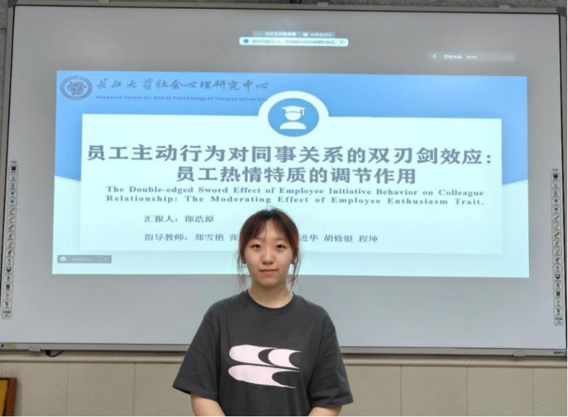 针对郎浩原同学的汇报,老师们首先肯定了该同学PPT制作的简洁性;其次建议其以汇报文献为基础,进一步探讨不同文化背景下的员工主动行为对同事关系的双刃剑效应是否成立;最后鼓励全体同学在生活中积极探索变量。