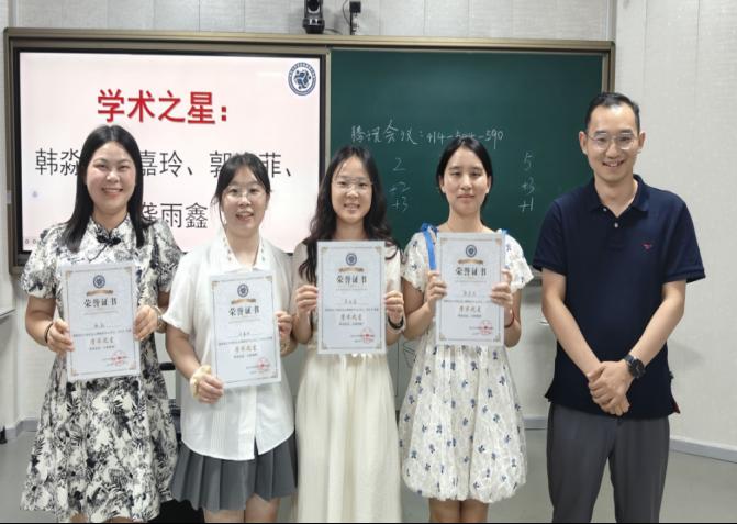 接着,获得2023-2024学年长大社心年度“学术之星”荣誉称号的员工是:心健QZ221班韩淼、教育学QX231班刘嘉玲、教育12102班龚雨鑫、教育12103班郭姿菲,由严磊老师为以上获奖者进行颁奖。