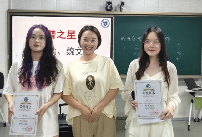 首先,获得2023-2024学年长大社心年度“编辑之星”荣誉称号的员工是:应心12202班郎浩源、教育12102班叶倩、英师12202班李子晗;获得2023-2024学年长大社心年度“科普之星”荣誉称号的员工是:心健QZ221班魏文欣、心健QZ231班李璐瑜,由甘进华老师为以上获奖者进行颁奖。