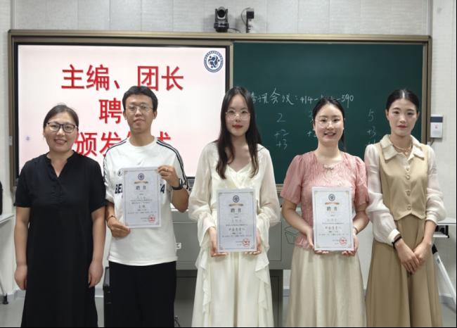 在聘书授予环节中,由卢小琴老师与陈佳琳老师对长大社心的团长(李韵佳、张艳君)、主编(周久远)授予聘书,团长与主编上台,接受证书,并发表感言。