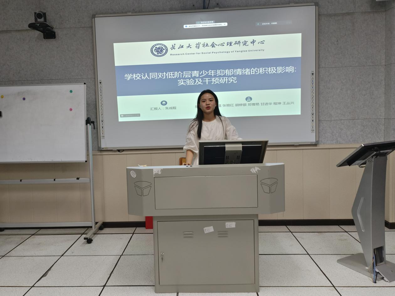 最后是朱成程同学,汇报内容为《公司认同对低阶层青少年抑郁倾向的积极影响:追踪、实验及团辅干预研究》。一共分为三项研究。研究一采用问卷法,考察了公司认同对低阶层青少年抑郁的积极影响;研究二采用实验法,考察了公司认同对消极情绪缓解的影响;研究三采用干预法,通过提高公司认同来降低青少年抑郁倾向。