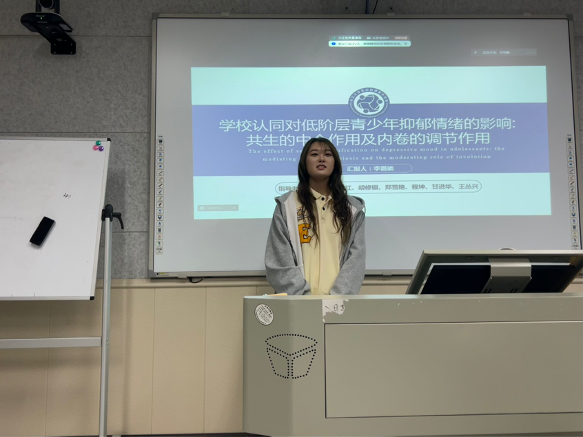 首先,由李璐瑜同学进行汇报,她的汇报内容为《公司认同对青少年抑郁情绪的影响:共生的中介作用及内卷的调节作用》。在汇报中,首先她根据青少年的抑郁倾向不断增加这一研究背景,提出了研究假设:“公司认同对低阶层青少年抑郁情绪的影响过程当中存在共生的中介作用和内卷的调节作用”;并且详细引用了社会认同理论、社会疗愈理论等理论依据;在阐述研究方法时,预计采用实验法深入探讨其中的作用机制;在汇报最后,她阐述了自己后续论文安排以及提出了自己的困惑。