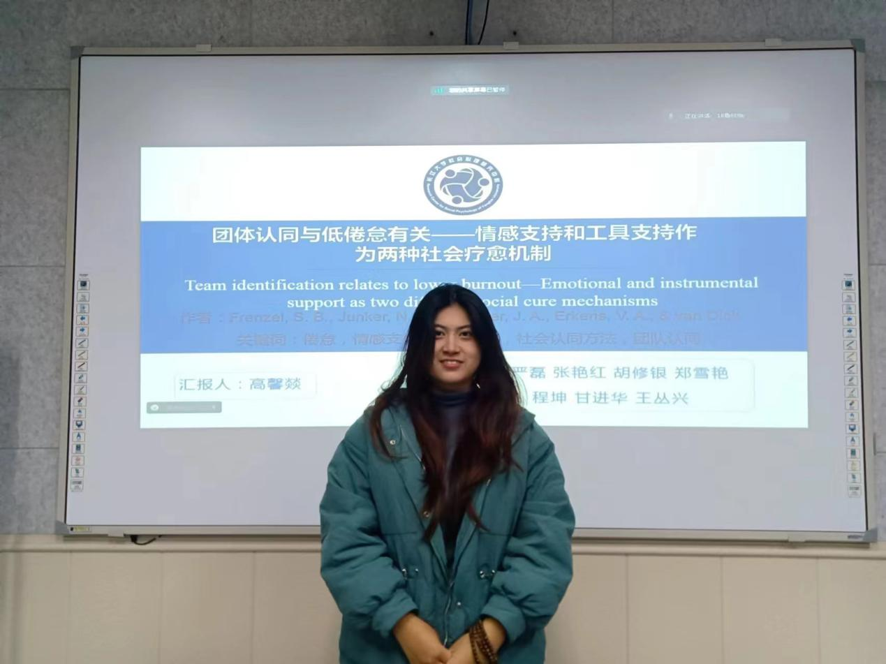 其次,由高馨燚同学进行汇报,题目为《团队认同与低倦怠相关——情感支持和工具支持是两种不同的社会治疗机制》,该研究通过情感支持和工具支持两种社会疗愈机制探究团队认同与低工作倦怠(情绪耗竭和工作疏离)间的关系。结果发现,团队认同通过情感支持的中介作用缓解工作疏离,但情感支持与情绪耗竭不相关所以团队认同不能通过情感支持的中介作用缓解情绪耗竭;团队认同通过工具支持和集体自我效能感的序列中介作用对情绪耗竭和工作疏离的间接影响显著。研究表明,团队认同通过情感性支持机制和工具性支持机制缓解工作倦怠。在汇报的最后,高馨燚同学向我们分享了自己的收获以及对这一文献的困惑。