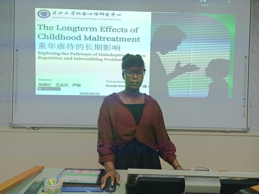 针对Annah同学的文献汇报,老师们首先肯定了其汇报PPT的制作很完善,汇报表达清晰,对文献的阅读和思考有深度。接着提出了以下建议:(1)对于该研究可以进行一个后续的跟进,所有童年虐待都会对一个人的成长造成不好的影响,思考其中有哪些调节变量可以改变不良影响?比如心理韧性等;(2)从研究跨度来看,该研究只在1.5年后对被试进行测量,但可能1.5年并未展现出童年经历的影响,所以需要考虑从多个时间点进行测量,以增强研究结果的效度。