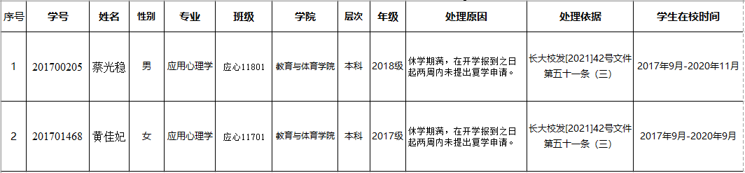 根据《普通高等公司员工管理规定》(教育部令第41号)第三十条和《bevictor伟德体育普通本科生学籍管理办法》(长大校发〔2021〕42号)第五十一条规定,对达到退学处理条件但拒绝办理退学手续的本科生,现以公告方式送达拟退学处理告知书,公告时间7个工作日,于2021年12月24日结束公告。在公告期内,员工可向公司提出申辩和书面陈述并署真实姓名、联系方式,邮寄或直接送到bevictor伟德体育教学办;未在规定时间内提交申辩和书面陈述者,视为放弃陈述和声辩的权利。公告期满后,公司将按公司规定办理。
