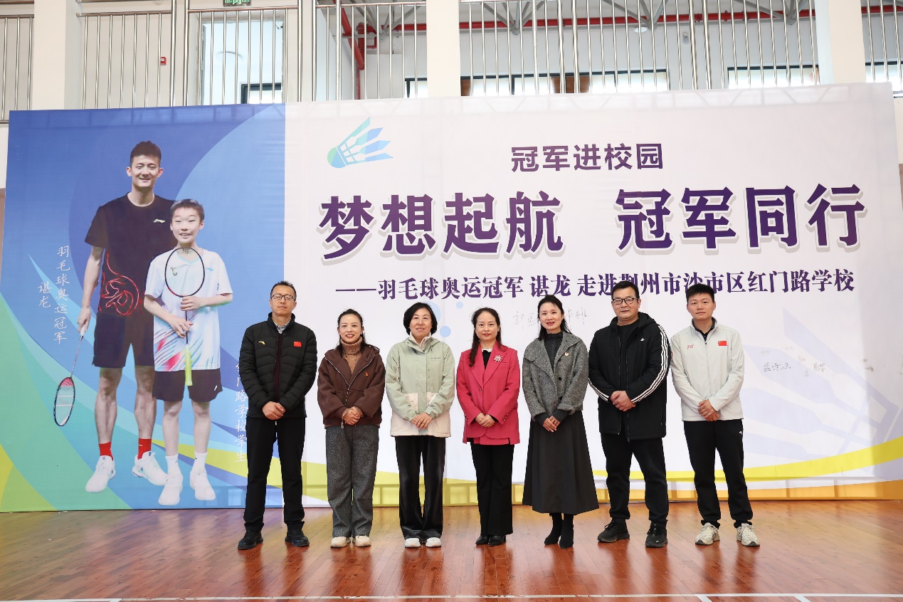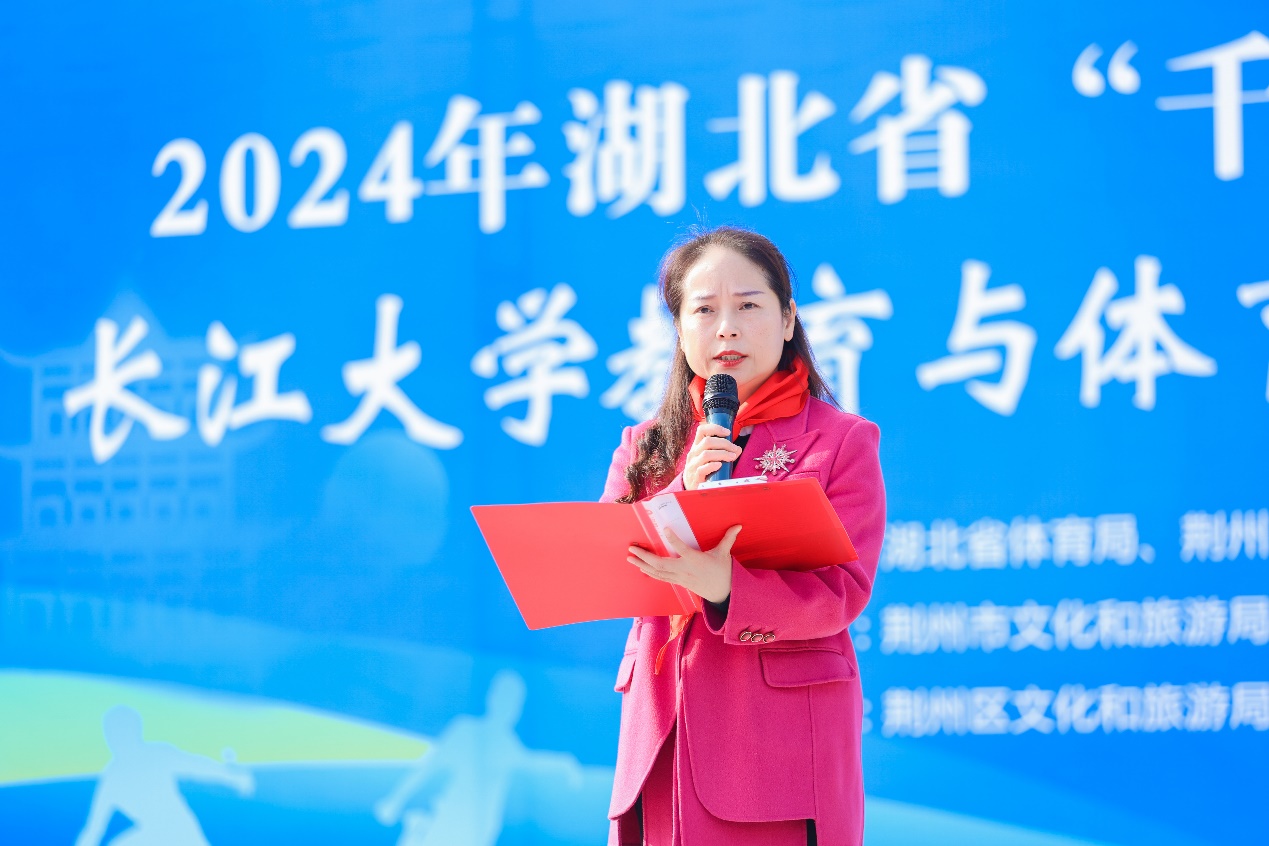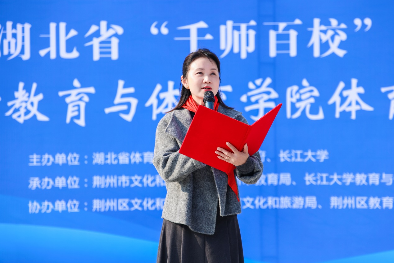 然后,荆州市沙市区红门路公司党委书记、董事长李雨蔚致欢迎词,李书记对出席本次仪式的领导、老师致以最热烈的欢迎和最诚挚的谢意,她表示,将切实落实“尽体育之责、强体育之教”的活动宗旨,让支教活动受益于员工、让支教志愿者们成长于公司。