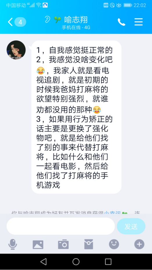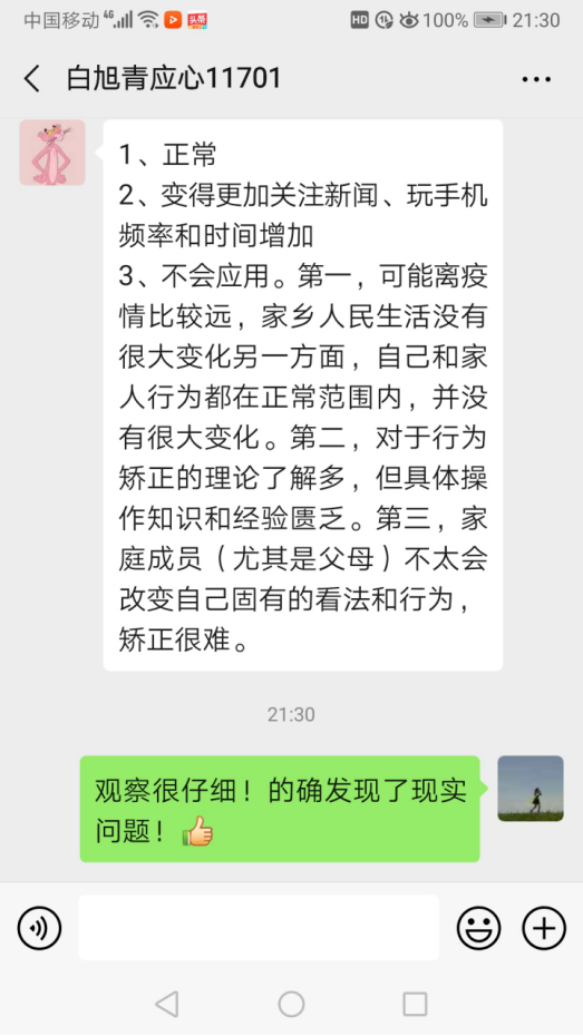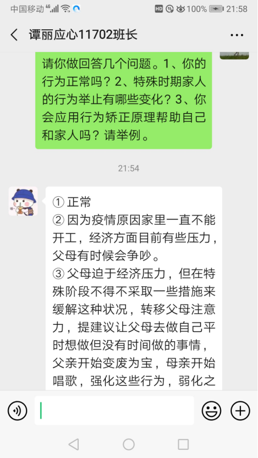 在教学过程中郑老师不仅注重员工对理论知识的掌握,更是充分发挥了课堂思政的作用,同时也对处于特殊时期的员工及时运用专业知识进行心理疏导。在网络教学过程中,郑老师要求同学们在听课前准备好笔和笔记本,坐在电脑前或者拿出手机放在桌上听课,这样便于集中注意力。促进同学们养成良好的学习习惯,在《儿童行为矫正》课中,鼓励同学们运用学到的知识点,对自己的良好行为进行强化,鼓励同学们运用专业知识帮助自己、家人和朋友。在授课过程中,有些同学有些焦虑、恐惧、悲伤等情绪,问到什么时候可以回公司,有些同学在家里呆久了烦躁无聊,有些同学每天过度关注疫情信息,甚至导致了替代性创伤,郑老师在课堂教学中结合案例,运用心理学知识安抚同学们情绪,帮助同学们客观分析各种信息,学会接纳,学会反思,学会沟通。让每个同学问问自己,“我在这场防疫战斗中,我的专业能为防控做点什么?”“我能做出什么贡献?”。