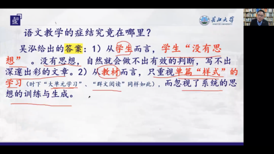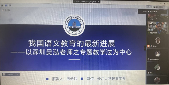 周会民博士讲座主题为《我国语文教育的最新进展—以深圳吴泓老师之专题教学法为中心》。周博士首先介绍了吴泓语文专题教学法的缘起,针对语文教学的症结,即员工没有思想、教材编撰不足等问题,吴泓老师给出了对策——要进行语文专题研究性学习。