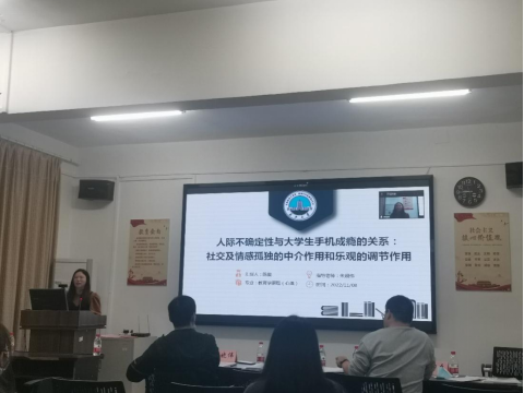 第三位是陈旋同学,她就“人际不确定性与老员工手机成瘾的关系:社交及情感孤独的中介作用和乐观的调节作用”作了汇报。陈旋同学首先解释了人际不确定性与手机成瘾的含义,通过四个量表进行了实验研究,并说明了研究结果、研究意义及存在的不足。