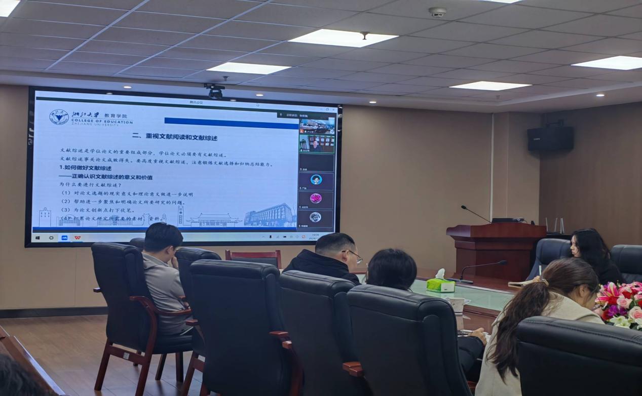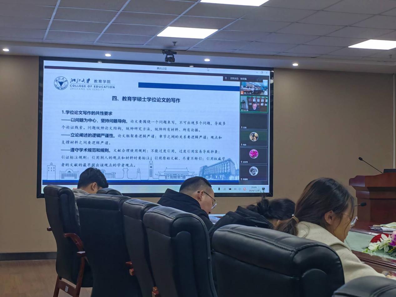 为了强化公司研究生导师培养,提升导师岗位胜任力,全面提高公司产品质量,尤其是学位论文质量。2024年12月4日晚,公司在文科大楼905会议室举行本学期第二场导师培训,本次特邀浙江大学张应强教授进行线上讲座,讲座主题为《教育学硕士学位论文的选题和写作》,公司教育学专业全体研究生导师参会,培训会由熊猛副经理主持。