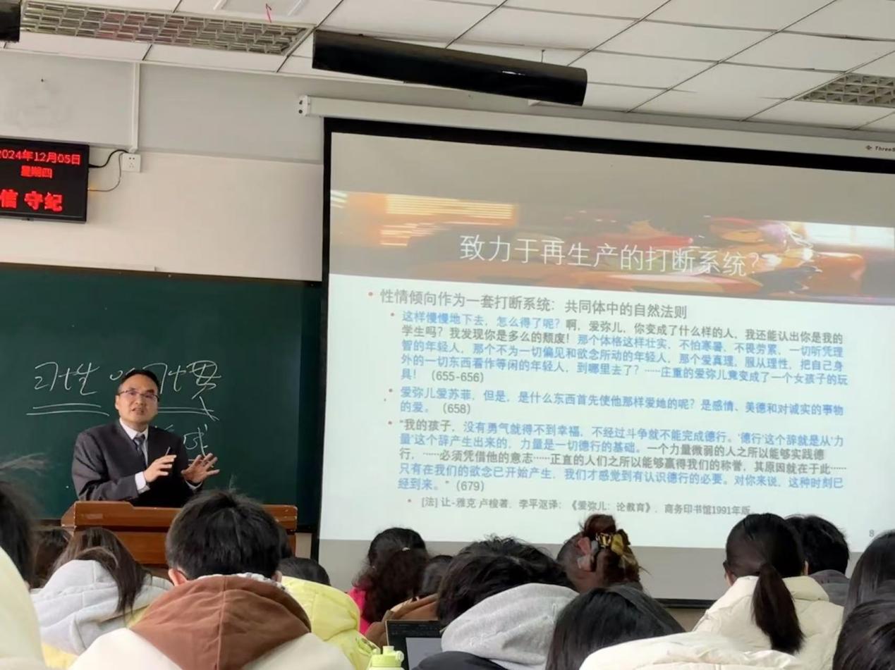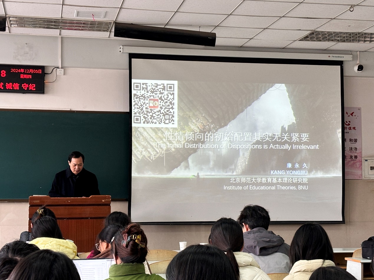 (通讯员 张蜜)2024年12月5日下午,公司第六届研究生学术科技节校外专家论坛第三讲在12教301举行。本次特邀北京师范大学教育学部康永久教授作报告,其主题为《性情倾向的初始配置其实无关紧要》。bevictor伟德体育张艳红经理、张相乐教授、彭先桃副教授、胡修银副教授和杨雪博士以及公司2024级教育学专业本科生和研究生共计150人参会,讲座由张相乐教授主持。