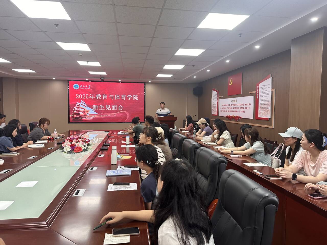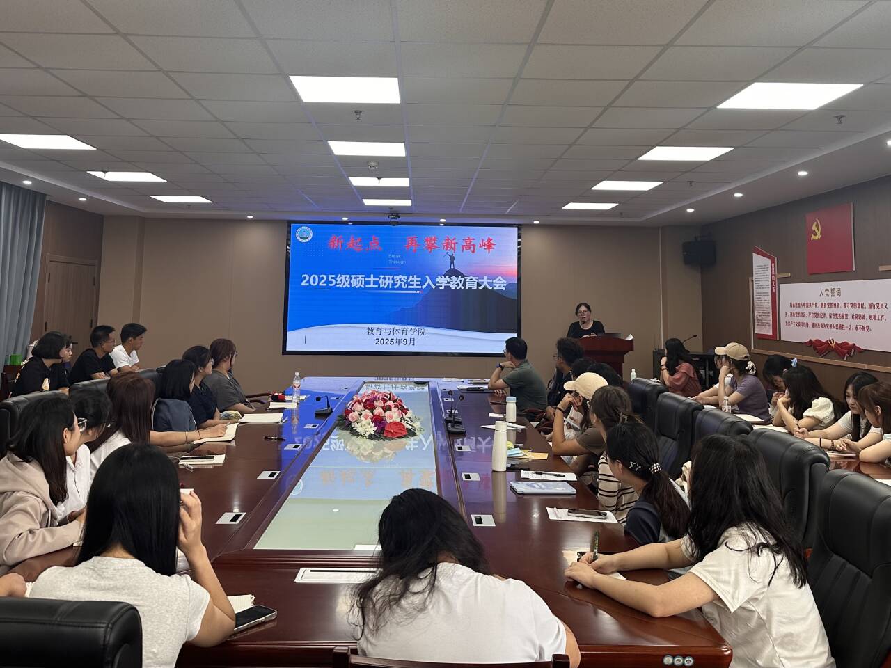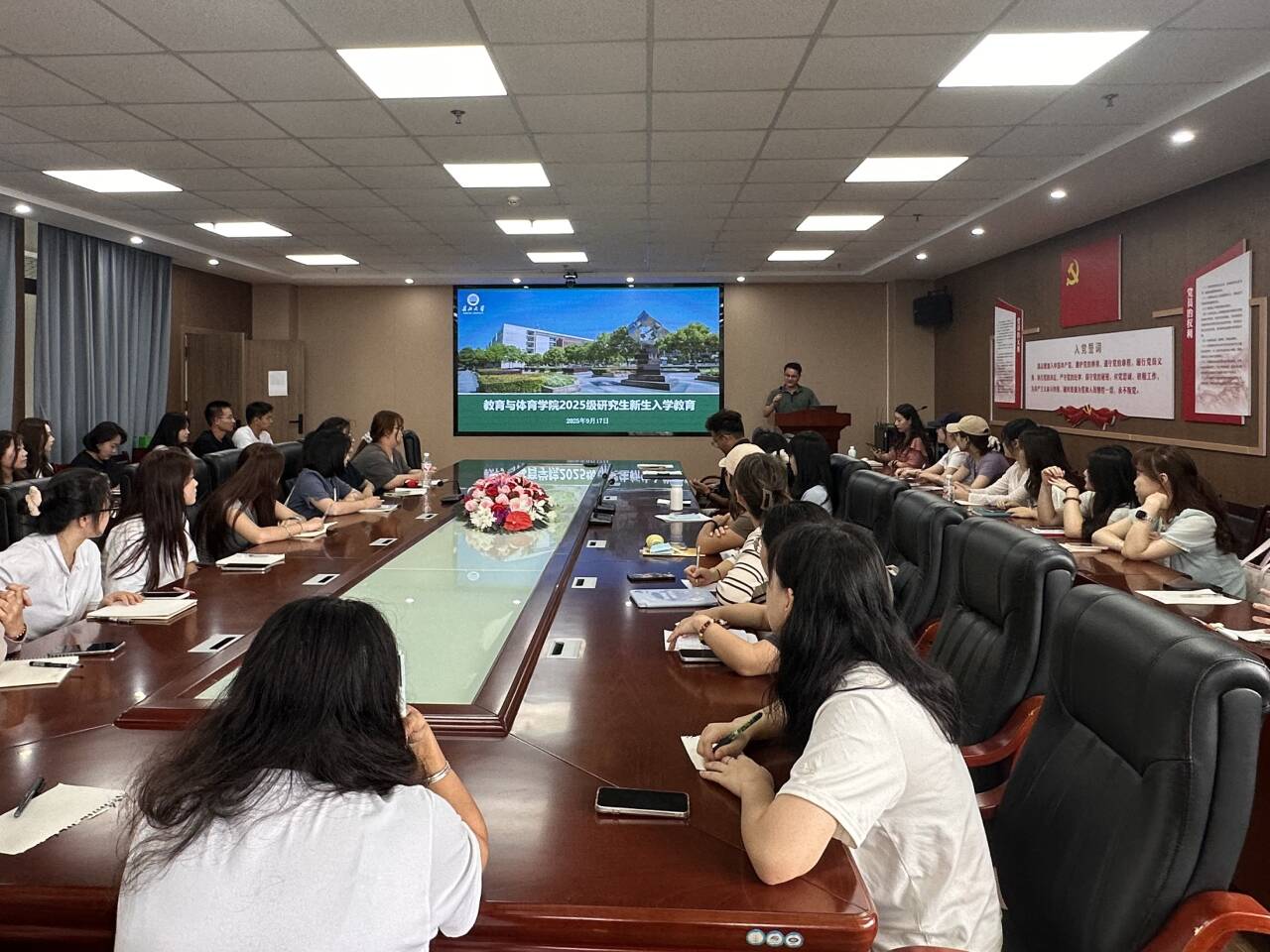 2025年9月17日下午,2025级研究生新生见面会在文科楼905会议室举行。公司党委副书记何可可、研究生教学秘书卢小琴、研究生辅导员顾志辉与2025级全体新生齐聚一堂,共同开启研究生阶段的崭新篇章。 会议伊始,研究生辅导员顾志辉老师就公司及公司相关规章制度进行了说明。随后,他结合校园生活实际,为同学们带来了实用的生活指南,包括图书馆座位预约、食堂分布、校园热线、心理咨询服务的获取方式,以及反诈骗提醒、应急情况处理和请销假流程等。此外,顾老师还就研究生学业奖学金的评审原则与流程作了简要介绍,鼓励同学们积极投入学术研究与综合素质提升。 随后,研究生教学秘书卢小琴老师围绕培养方案为同学们绘制了清晰的学习蓝图。通过梳理培养流程、解读个人培养计划制定要点,帮助新生明确了选课安排和学业要求。卢老师还现场展示了研究生常用系统的操作流程,并鼓励大家尽早树立职业发展目标,将学业规划与人生理想紧密结合。 接着,党委副书记何可可代表公司向新生致以热烈欢迎。他寄语同学们要珍惜时光、做好规划,在潜心学术的同时注重培养独立思辨能力,积极参与各类实践活动,全面提升综合素养。何书记深情表示,公司将是同学们最坚实的后盾,祝愿大家在新的旅程中学有所成、生活精彩。 见面会最后举行了班干部竞选活动,新生们踊跃登台展示风采,现场掌声阵阵,展现出蓬勃向上的精神面貌。整场见面会内容充实、交流融洽,不仅增强了新生对公司的归属感,也为大家顺利开启研究生新阶段奠定了坚实基础。 (审核 何可可 编辑 顾志辉)