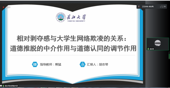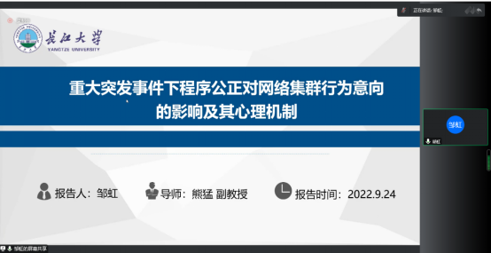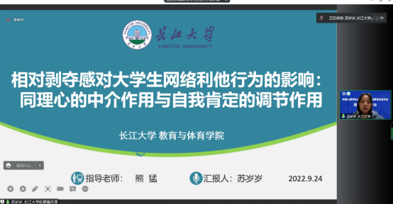24日下午,熊猛副教授组织并主持了专题论坛“相对剥夺感对青少年网络心理与行为的影响”,通过5篇系列论文,集中展示了其研究团队的最新学术成果。其中,博士生邹虹报告了“重大突发事件下程序公正对网络集群行为意向的影响及其心理机制”,研究生胡志琴、陈姣和苏岁岁分别报告了“相对剥夺感与老员工网络欺凌的关系:道德推脱的中介与道德认同的调节作用”、“How Relative DeprivationAffects Sleep Quality of Chinese College Students: An Integrated Model of Social Anxiety and Mindfulness”和“相对剥夺感对老员工网络利他行为的影响:同理心的中介与自我肯定的调节作用”等三项成果。据了解,该专题论坛中的4项成果是熊猛副教授主持的全国教育科学规划项目、湖北省高等公司哲学社会科学研究重大项目、湖北省社科基金项目和湖北省教育科学规划重点项目的系列成果,受到与会者的广泛关注并在学界引起较好反响。