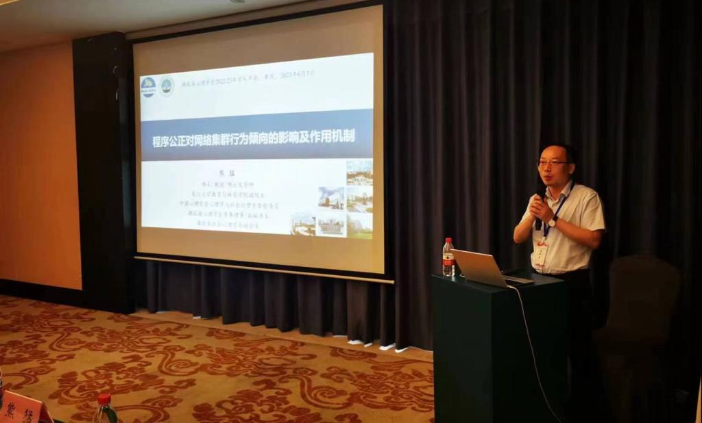 在大会报告环节,张艳红教授受邀在主会场作了“孤独感与手机成瘾”的大会重点报告并主持了社会与人格心理论坛分会场报告;熊猛教授受邀主持了网络心理与行为论坛分会场并作了“程序公正对网络集群行为倾向的影响及作用机制”的主题报告;朱晓伟副教授受邀参与了心理学人才培养论坛分会场研讨交流。心理学研究生程丽媛、魏文欣、任杰和体育学研究生杨玉娟分别围绕“网络小说成瘾与抑郁”、“权力感与老员工亲社会行为”、“童年压力与锻炼承诺”、“拖延行为的现状、热点与前沿”等主题在分会场作了学术报告。闭幕式上还举行了学术年会优秀论文颁奖仪式,熊猛教授提交的研究成果《程序公正对网络集群行为倾向的影响及作用机制》荣获优秀论文一等奖。