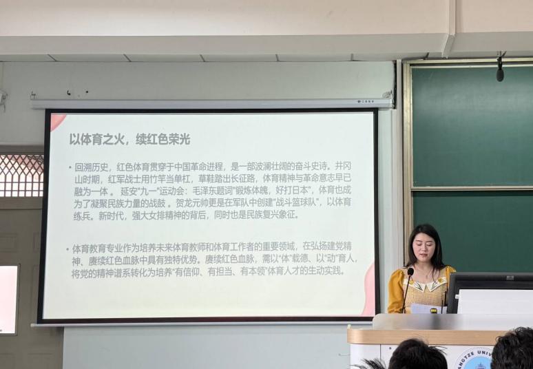 最后,刘甜甜同学指出我们可以通过加强宣传教育、开展实践活动、立足本职岗位来传承和弘扬新时代精神,在公司中融入红色文化课程,利用新媒体平台来扩大宣传范围。体育教育专业作为培养未来体育教师和体育工作者的重要领域,在弘扬建党精神、赓续红色血脉中具有独特优势。