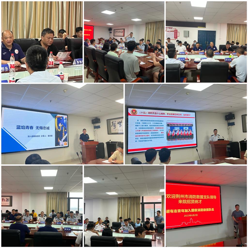 仪式伊始,高明成书记介绍出席领导并致欢迎词,为荆州市消防救援支队的到来表示热烈欢迎。经理张相乐介绍了公司基本情况,指出毕业之际,除了部分员工计划继续求学深造之外,大部分员工均面临就业问题,消防救援这一工作神圣而又光荣,是员工们的较好选择之一。其次,新训消防员潘诗里分享了个人的新训感受,分别从为什么会加入荆州市消防救援支队、参训后的个人感悟和收获以及后期个人发展目标等方面进行了分享。随后,队务督察科科长李小宁针对报考的相关政策进行了详实的讲解,明晰了报考时间、报考对象、入队相关待遇及后续发展前景等问题。答疑互动环节,政治部主任阳家军对员工们提出的疑问逐一进行了亲切耐心的回答。最后,员工代表上台发言,指出此次宣讲会收获颇多,进一步了解了相关的招考政策,表明了更加想要报考的意愿。