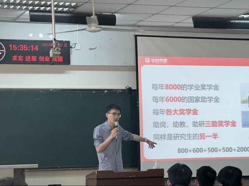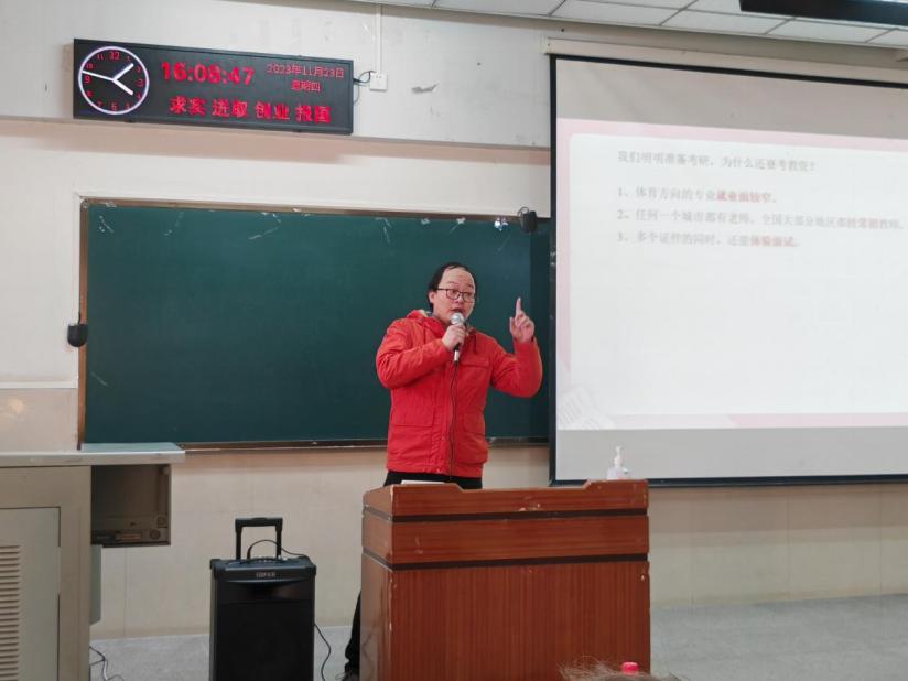 随后,华图教育机构的郭锦圆老师进行考研动员。他结合当前考研形势与政策,就考研的重要性、考研的内容和方向等向同学们作了详细的介绍。郭老师从实际出发,梳理历年考研的录取情况,带领大家了解考研的基本动态,为同学们的院校和专业选择等具体事项提供了专业分析,勉励同学们积极备考,明确自身发展方向,立足个人能力与考研形势进行理性分析与选择。最后,陈儒雅老师讲解了教团队格证面试考情考务、答题技巧,鼓励同学们考教资,拓宽就业面,在多个证件的同时体验面试,提高自己的专业素养。