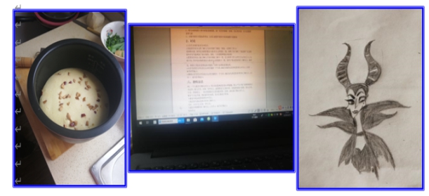 刘晶烁:“在网上学习阶段,我有了更好的生活规律。有时候第一节课有课就早起上课,没事的时候去看其他网课进行学习。刚好这学期学美术基础,我也可以在平时画卡通人物。有时候看看新闻了解一下时事,还有时间可以进行一下自我思考。”