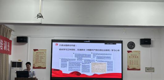 主题研讨环节,王康熙同志对党支部每日党纪学习的内容进行总结,汪瑛倩同志、杨贝贝同志结合党纪专题学习内容,分享了个人的学习心得,并指出今后将继续加强党纪学习,在实际生活中展现对政治原则、政治方向的坚守和践行。
