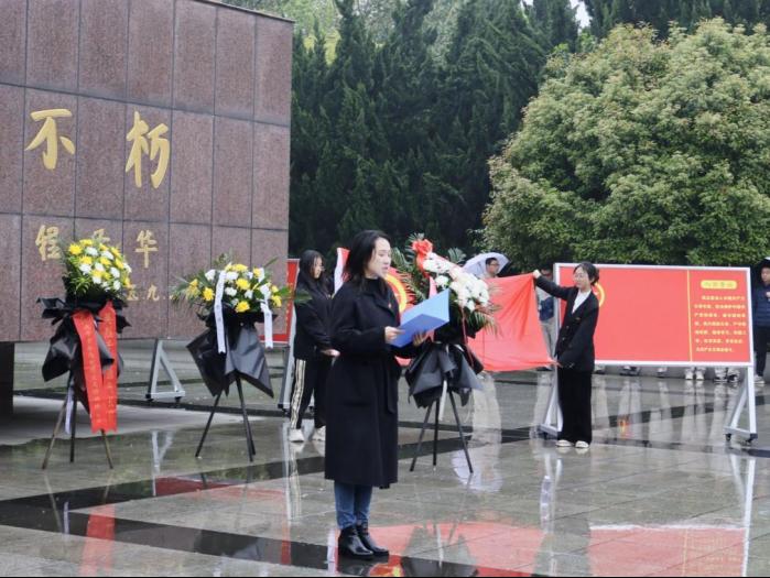 活动伊始,全体肃立,奏唱国歌。员工代表为烈士们敬献花圈。烈士纪念碑前,全体学员整齐列队,鞠躬默哀,表达对革命先烈深切缅怀和崇敬之情。活动中,任雯婷老师发表讲话,她表示,同学们要铭记历史、心怀前人,不忘初心、不负祖国。同时,她呼吁学员们学习先烈们的坚强意志,做奋勇拼搏的一代人,担起中国青年的时代责任。全体学员在纪念碑前重温入团誓词,缅怀革命先烈的丰功伟绩,寄托对革命先烈的无限哀思。