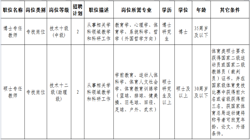 为更好推进公司教学科研事业的发展,特招聘专任教师4名,具体职位名称、所需专业和招聘条件见下表: