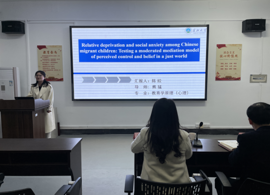 罗学敏汇报的主题为《创业领导力对老员工创业意向的影响》,指出创业警觉性和感知行为控制这两个中介变量起到的作用,构建了一个创业警觉性与感知行为控制关系的中介模型,模型拟合程度良好,研究结果说服力强;胡志琴针对相对剥夺感与老员工网络欺凌的关系展开全面透彻的思考,并提出道德推脱的中介作用与道德认同的调节作用,角度新颖,最后号召大家自觉抵制网络暴力,发人深思;陈思园汇报了老员工群体认同与主观幸福感:社会联结和心理融合的多重中介效应,为我们研究老员工认同与主观幸福感提供了新视角;陈姣作了题为《Relative deprivation and social anxiety among Chinese migrant children: Testing a moderated mediation model of perceived control and belief in a just world》的英文汇报,研究采用问卷方式,对流动儿童的相对剥夺感与社会焦虑开展了深入调查,并对控制感知与公平世界信念的调节中介模型进行检验,数据分析简明合理,让我们对流动儿童的相对剥夺感与社会焦虑的形成原因有了更深入的了解。