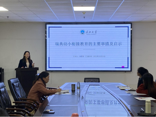 最后是肖燕琴同学,她就“瑞典幼小衔接教育的主要举措及启示”做了专题报告。报告从研究背景及意义、研究方法及思路、研究的主要内容以及研究创新与不足四个部分展开,通过对瑞典幼小衔接教育相关政策的梳理归纳,提出要把学前教育纳入到基础公司教育系统,将儿童和青少年的教育活动有机整合于终身学习过程中的观点,为我们今后做学术研究提供了新的思路。