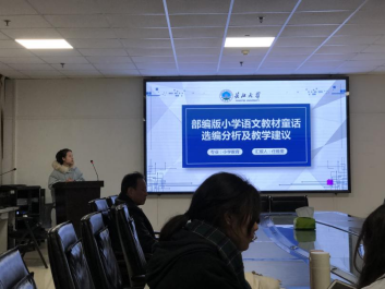 其次是任雅雯同学,她就“部编版小学语文教材童话选编分析及教学建议”做了专题报告。任雅雯同学从概念界定入手,从义务教育语文课程标准、童话在小学语文教材中所占的比例、部编版童话选编的研究内容较少进行了分析。之后从理论和实践两方面讲解了研究意义,并用数据说话,提出了童话建议教学。