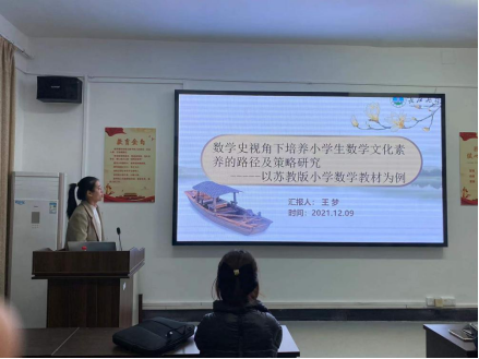 其次是来自小学教育学专业的王梦同学,她就“数学史视角下培养小员工数学文化素养的路径及策略研究”做了专题报告。本研究以“数学史”、“数学史与小学教育”、“小员工数学文化素养”、“培养策略”等主题进行文献检索与收集,了解国内外数学史的内涵、教育价值以及数学史整合数学教育的研究现状,在此基础上拟定论文的主题及研究方案,并以已有的研究理论为本研究提供研究基础和理论支撑。