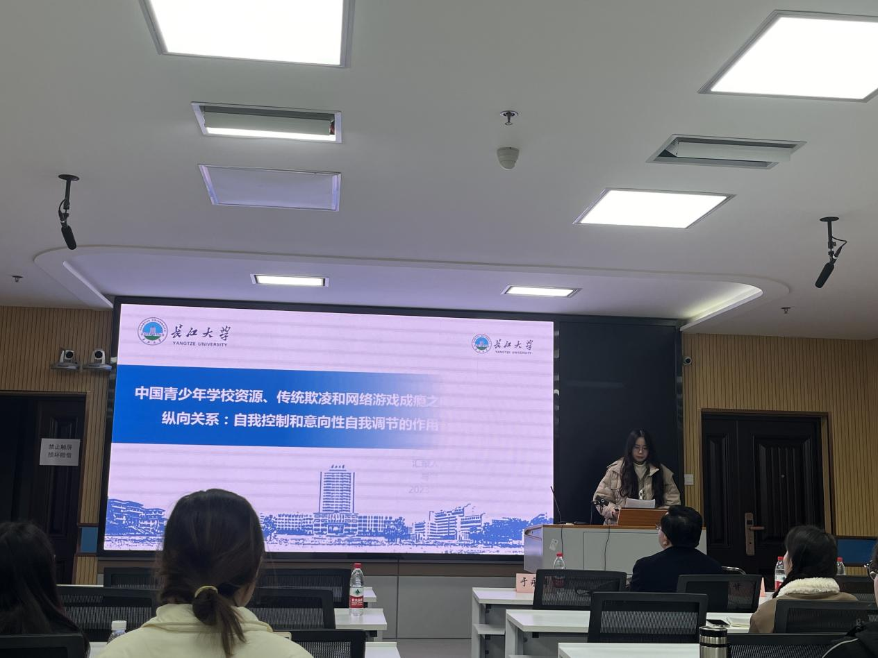 秦珂楠汇报的主题为《中国青少年公司资源、传统欺凌和网络游戏成瘾之间的纵向关系:自我控制和意向性自我调节的作用》,她指出自我控制在公司资源和传统欺凌的关系以及公司资源和网络游戏成瘾的关系中起中介作用,意向性自我调节在模型中的调节作用,模型拟合程度良好,研究结果说服力强。