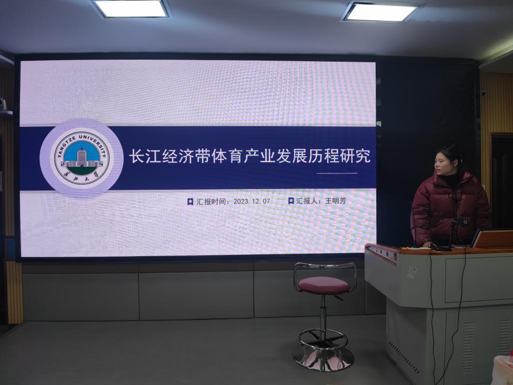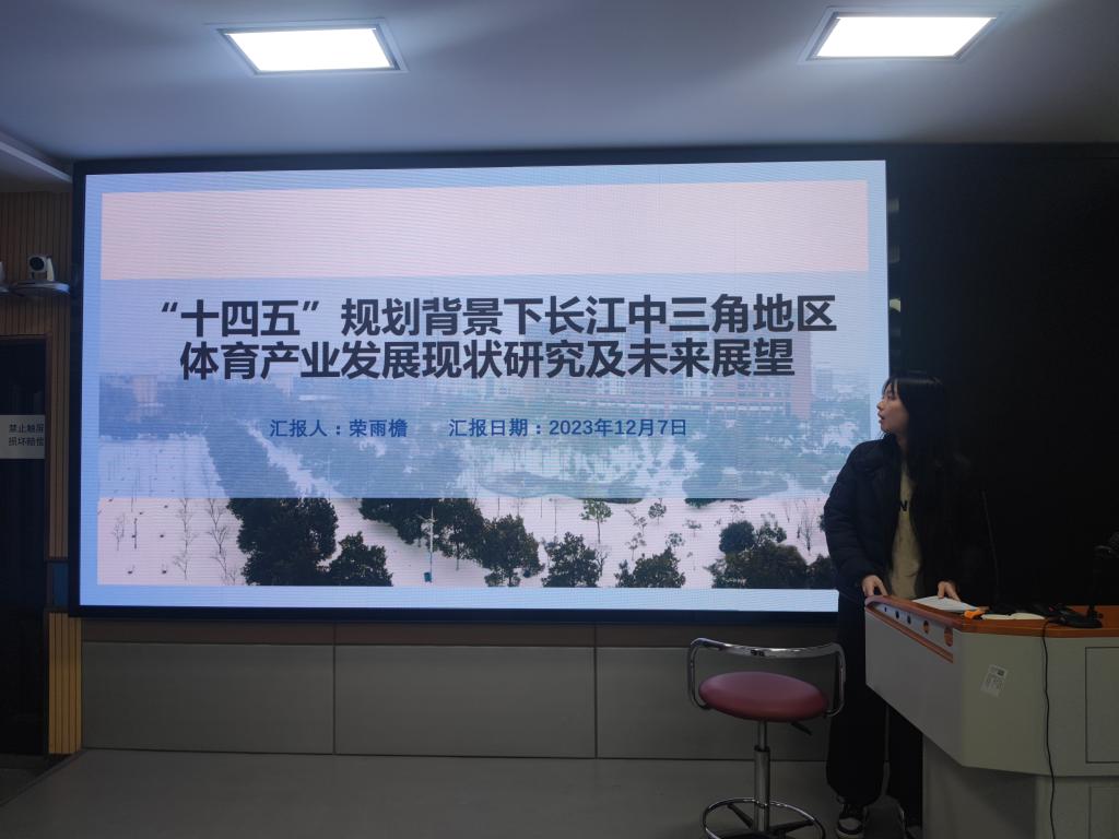 王明芳同学对长江经济带体育产业发展历程中的现有优势、现有困境和实施路径这三个方面进行了研究分析。王明芳强调,针对现有困境,可从促进“现代化体育服务业发展→推动高端体育制造业发展→推进产业融合发展→打造体育促进双循环新格局建设引领区”这一发展路径,从而推动长江经济带体育产业的发展。该实施路径为同学们在长江经济带体育产业的研究中提供了新的视角。