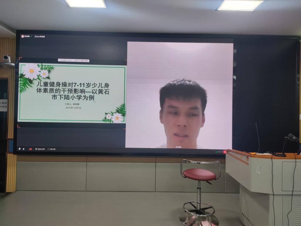 陈舒鹏同学的汇报主题为“儿童健身操对7-11岁少儿身体素质的干预影响——以黄石市下陆小学为例”。陈舒鹏指出,党和国家高度重视青少年体质问题,为此,湖北省体育局、湖北省教育厅下发了《2022年湖北省青少年体制健康干预试点工作实施方案》,据此,本项研究通过运动干预操对黄石市下陆小学二至四年级员工身体素质的各项指标的结果进行处理分析,该项干预试点工作为期三年。目前研究结果发现运动干预操仅在五十米跑、握力、PACER、闭眼单脚站立这四个指标上有一定效果,后续需对干预设计进行进一步的改进并继续追踪。