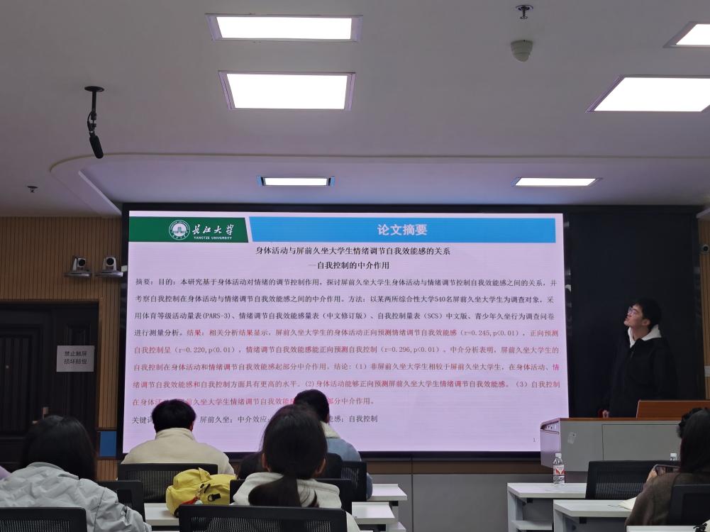王志文汇报的主题是《身体活动与屏前久坐老员工情绪调节自我效能感的关系-自我控制的中介作用》,他以两所综合性大学540名屏前久坐老员工为调查对象,采用体育等级活动量表(PARS-3)、情绪调节自我效能感量表(中文修订版)、自我控制量表(SCS)中文版、青少年久坐行为调查问卷进行测量分析,深入探讨了屏前久坐老员工身体活动与情绪调节控制自我效能感之间的相关关系。