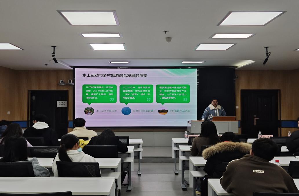 田丽汇报的主题是《宣恩县水上运动与乡村旅游融合发展研究》,她从水上运动与乡村旅游融合发展的演变、水上运动与乡村旅游融合发展的发展机制以及水上运动与乡村旅游融合发展的优化路径三个方面来综合探究了宣恩县的水上运动和乡村旅游。
