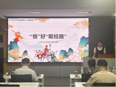 接着是三位入选全国决赛的选手依次开始试讲,每位同学授课结束后,专家和老师进行点评指导。汪英倩针对的是七年级,主要内容为积极合理归因。通过西游记师徒四人取经的故事切入归因主题。教师点评环节,陈璇老师认为选题对于七年级来讲确实很有挑战,让七年级认识并正确运用归因理论较为困难。周婷老师认为PPT制作应该更贴合七年级生活。