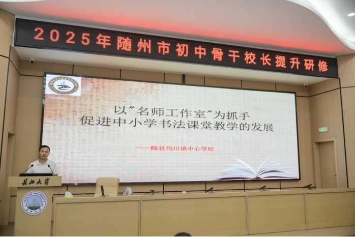 随县均川镇中心公司张俊董事长汇报的主题是:《以"名师工作室"为抓手 促进公司书法课堂教学的发展》,重点阐述了公司以名师工作室为依托开展书法课特色课程的经验。