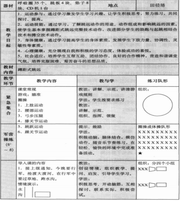 高二年级员工有一定的跳远基础,大多数员工能完成蹲距式跳远的完整技术动作,但员工的掌握程度参差不齐,个别差异明显。在助跑与起跳相结合和腾空技术上需进一步改进提高。